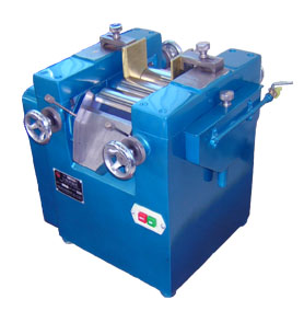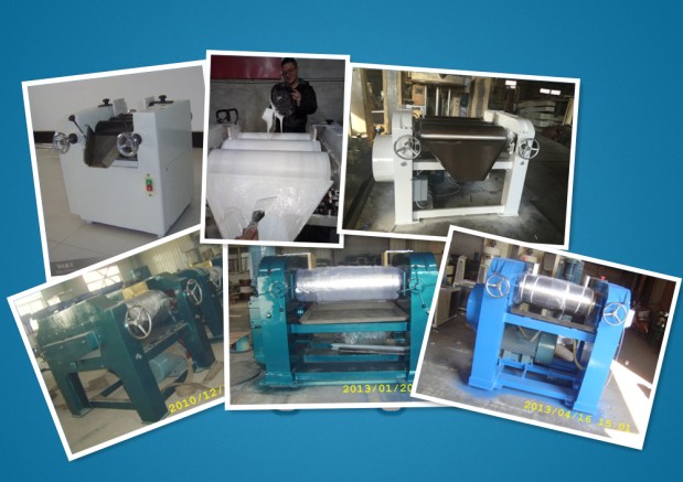 該設(shè)備由三個輥筒組成,裝在一個機架上,由電機直接帶動。一般輥筒間的轉(zhuǎn)動方向不同,前輥向前轉(zhuǎn)動,中輥向后轉(zhuǎn)動。輥子轉(zhuǎn)速前輥快、后輥慢。中間輥固定,前后兩輥裝在滑道上,有彈簧裝置,用手輪調(diào)節(jié)前后輥與中輥的距離。物料由后輥與中輥之間進入,受到輥筒的擠壓,產(chǎn)品顆粒變細,然后由快輥帶出,快輥末端裝有刮刀,使物料與輥筒分離,落入收集桶內(nèi)。由于研磨過程產(chǎn)生大量熱量,各輥筒的中心是設(shè)計為空心結(jié)構(gòu),通水冷卻,保證產(chǎn)品質(zhì)量。